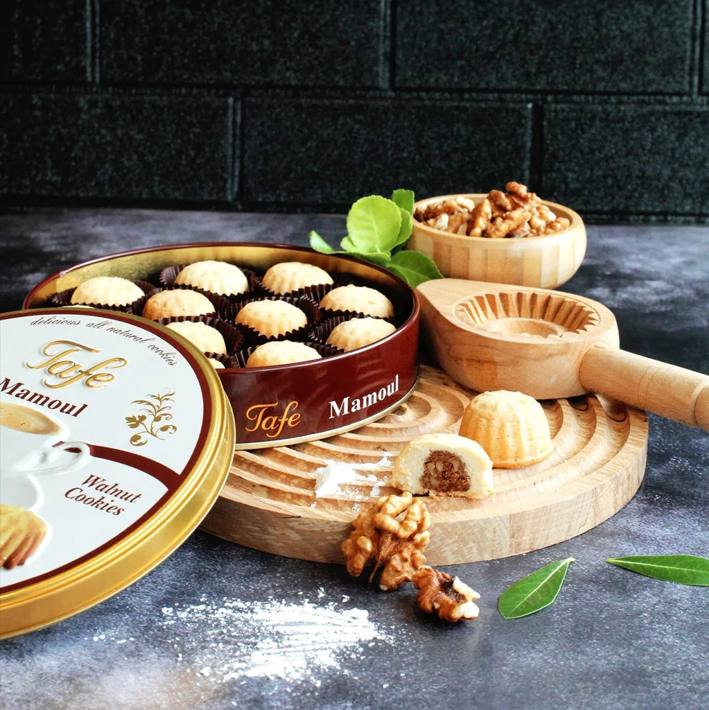 Maamoul med valnötter är ett traditionellt och smakrikt bakverk fyllt med en generös valnötsfyllning. Den lena, smuliga degen omfamnar en fyllning med valnötter och dadlar, vilket ger en djup, nötig och naturligt söt smak. Kanel och vaniljarom bidrar med en varm och rund avslutning som gör varje tugga extra njutbar. Detta bakverk är ett uppskattat inslag vid högtider, fika eller som en elegant liten dessert, perfekt för dig som älskar klassiska smaker och genuint hantverksbakade produkter.