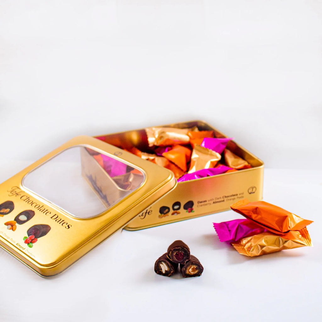 Denna generösa mix består av dadlar täckta med choklad i flera smakvarianter. Kombinationen av naturligt söta dadlar och len choklad kompletteras av smakrika inslag som mandel, apelsinskal och tranbär. Resultatet är en elegant och varierad konfektyr med både fruktig friskhet och nötiga toner, perfekt för dig som vill njuta av flera smaker i en och samma förpackning. Mixen är ett utmärkt val vid bjudningar, högtider eller som en lyxig detalj till kaffestunden.